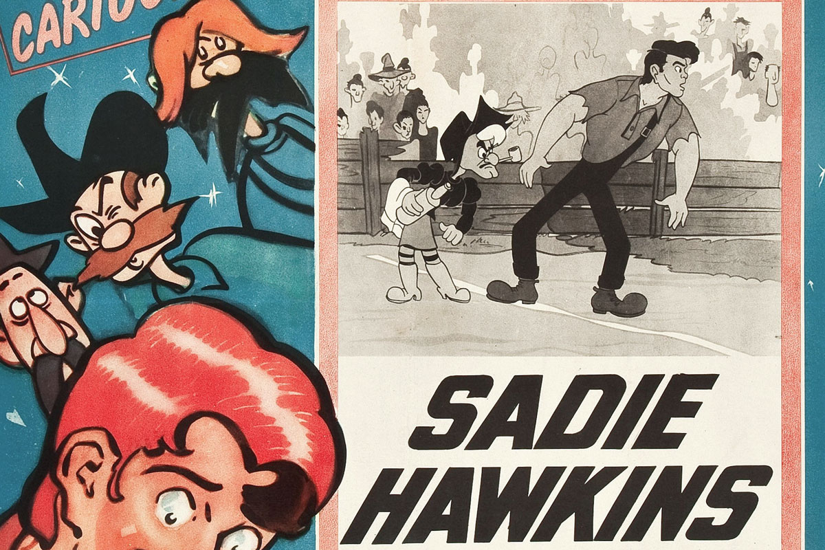 Mind you, Sadie Hawkins wasn’t a real person. She was a comic-strip creation dreamed up in the late 1930s by cartoonist Al Capp for his wildly popular comic Li’l Abner. At its peak, Li’l Abner ran in 900 newspapers in the U.S., and it remained in print until 1977. Set in the rural town of Dogpatch, Kentucky, the strip was filled with broad satire and a large cast of quirky, unforgettable characters. Among them were the handsome and gullible Li’l Abner Yokum, his eternally patient sweetheart Daisy Mae Scragg, the perpetually unlucky Joe Btfsplk, and the scheming industrialist General Bullmoose. But Sadie Hawkins proved to be the character whose antics took her from the comics page into real-life.