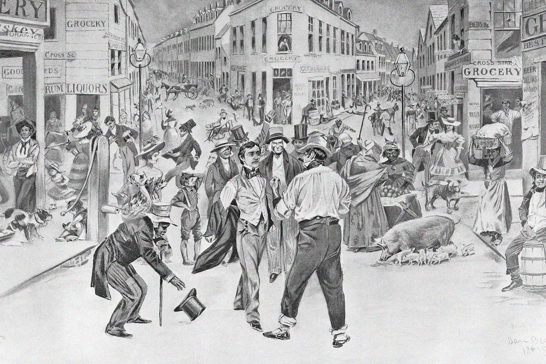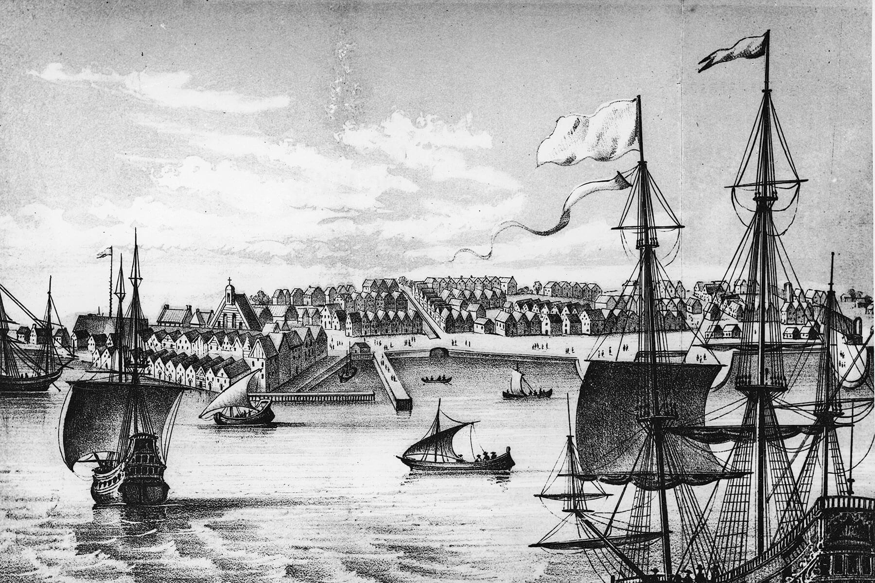 The first known inhabitants of what is now New York City were the Lenape (aka Delaware), an Indigenous people native to the northeastern U.S. Their villages were groupings of round-shaped wigwams constructed from bark, some of which were large enough to function as communal housing. The name “Manhattan” comes from the Lenape “Manahatta,” their word for a hilly, forested area, which roughly translates to “the place for gathering wood to make bows.” But when Dutch colonists acquired the land around New York Harbor in 1626, they named it New Amsterdam.