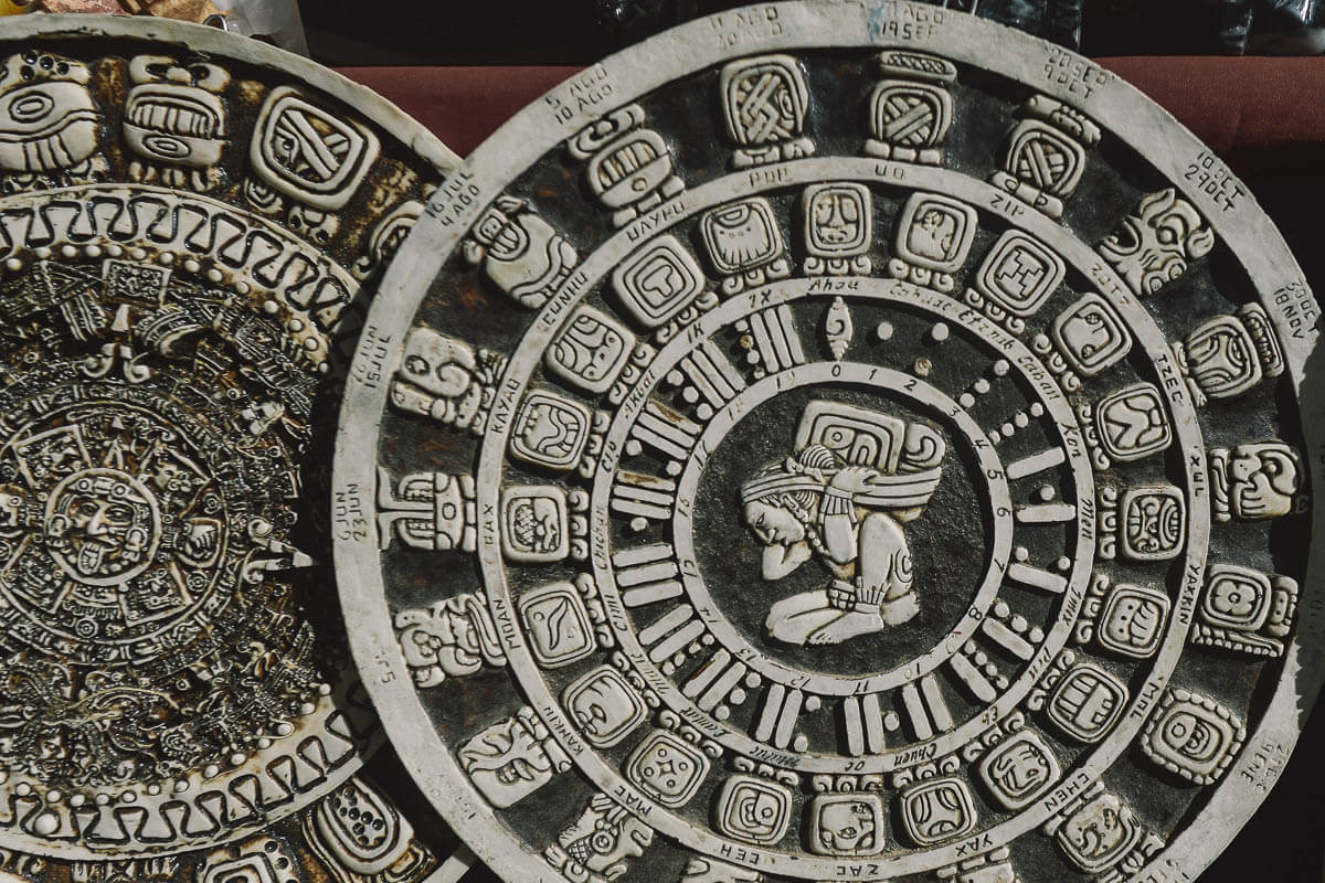 The numerical system used by the Maya, as well as many other Mesoamerican cultures, was a vigesimal (or “base 20”) system. While our modern “base 10” system uses 1, 10, 100, 1,000, and so on, the Maya used 1, 20, 400, 8,000, etc. The Maya system was much more effective for counting than the confusing system of numerals used in the Roman Empire, and the Maya also devised the concept of zero (perhaps around the year 36 BCE), a major mathematical accomplishment. The Maya leveraged their mathematical skills to build impressive cities, chart astronomical movement (using little more than geometry and some sticks), and develop their famous calendar. Speaking of which…