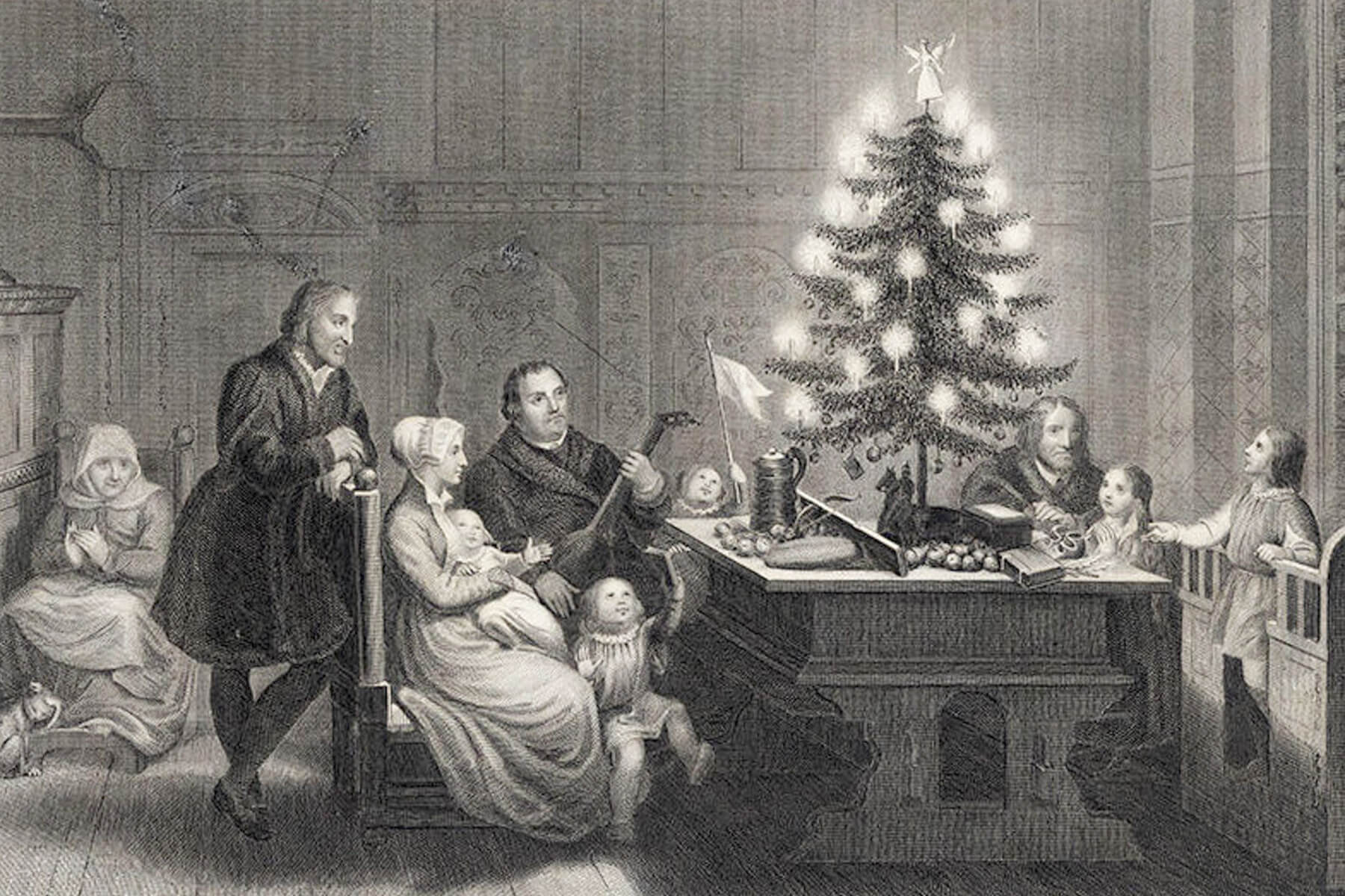 According to Judith Flanders’ Christmas, A Biography, the emergence of trees to commemorate the season were in part inspired by the “paradise plays” that were popular in Europe during the Middle Ages. Staged in observance of the Christian feast day of Adam and Eve on December 24, the plays typically featured an evergreen fir, festooned with apples, as the stand-in for the symbolic tree of life.